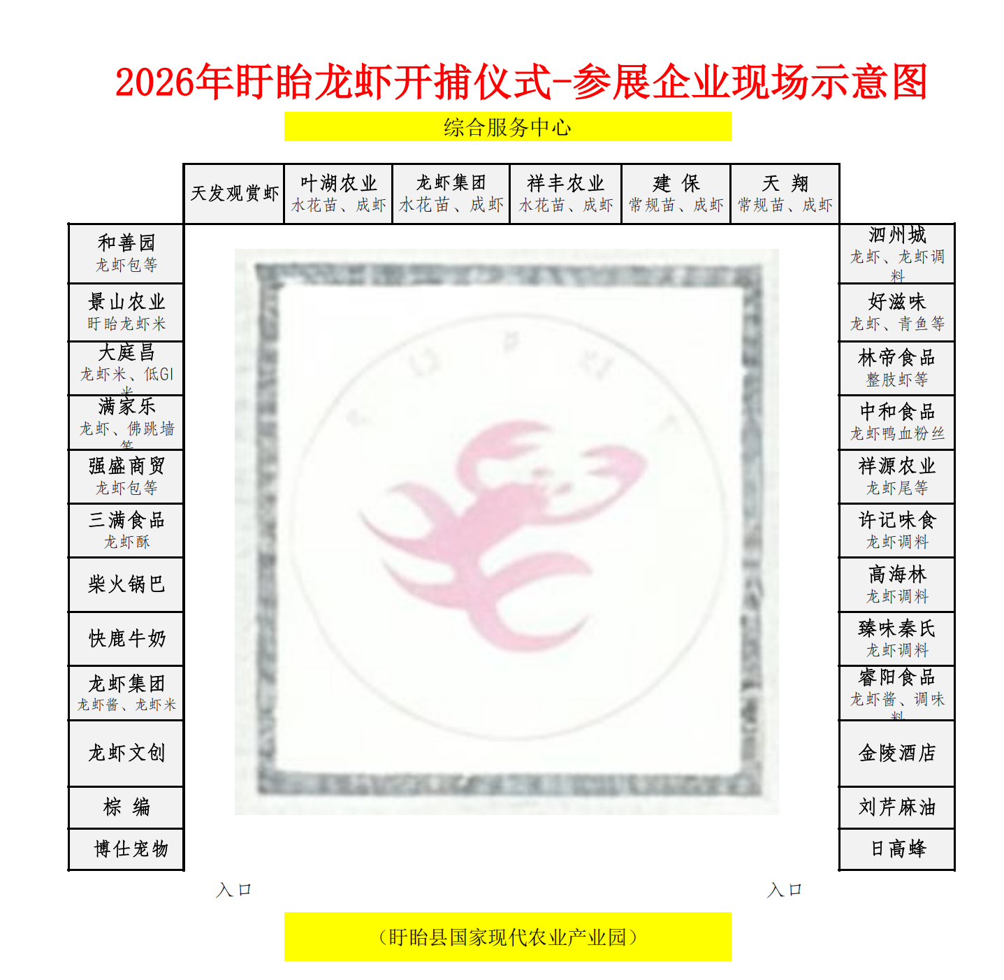 2026年盱眙龙虾开捕仪式将于4月3日上午在淮河镇明祖陵国家现代农业产业园综合服务中心举行。活动期间,我县龙虾一二三产相关经营主体及农特优产品商户将同步开展现场展销。现将参展有关事项通知如下: